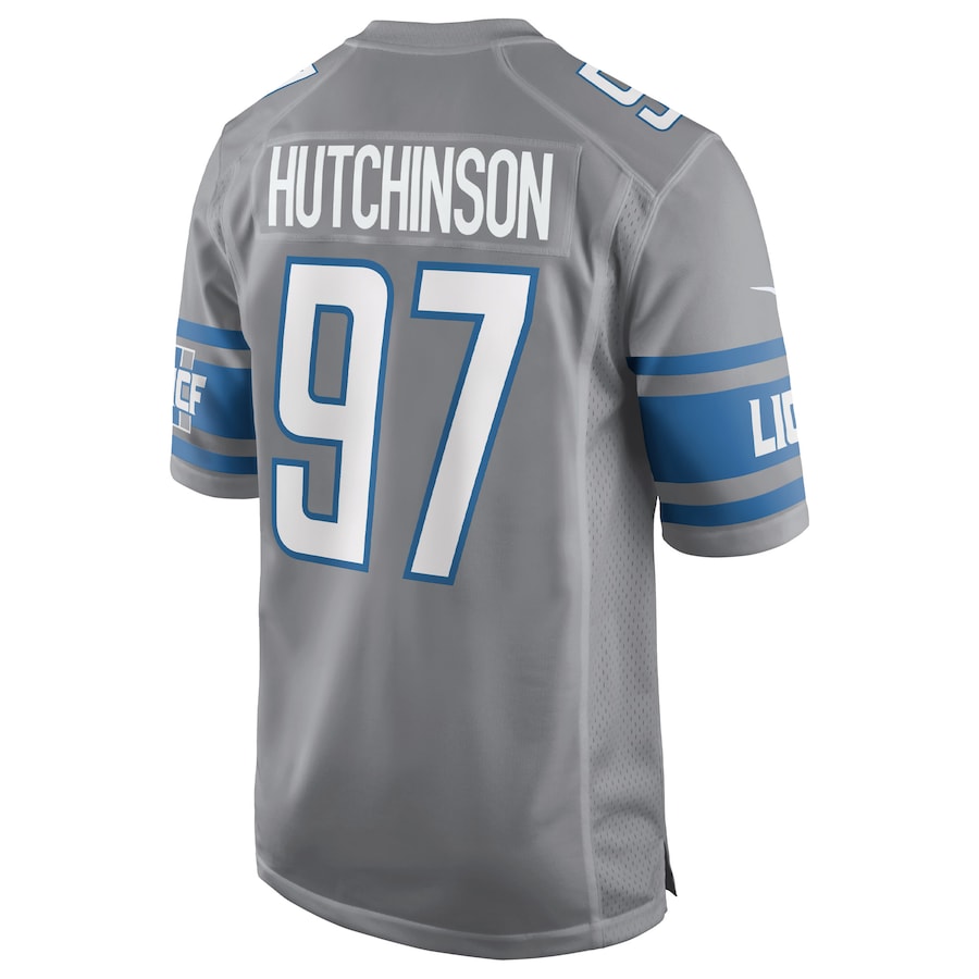 Introducing the Aidan Hutchinson Silver Detroit Lions Game Jersey. Made with high-quality materials, this jersey is designed for comfort and durability. Show your support for the Detroit Lions with this expertly crafted jersey featuring Aidan Hutchinson's name and number. Get yours today and join the team in style.