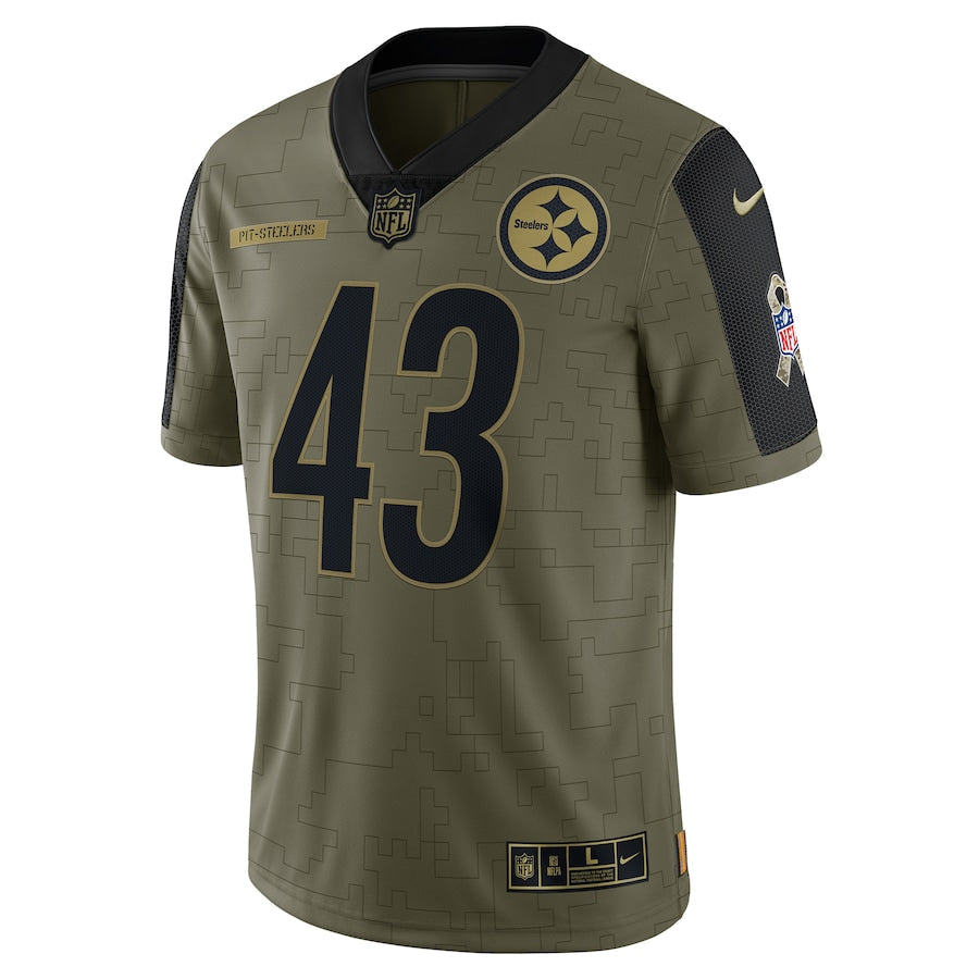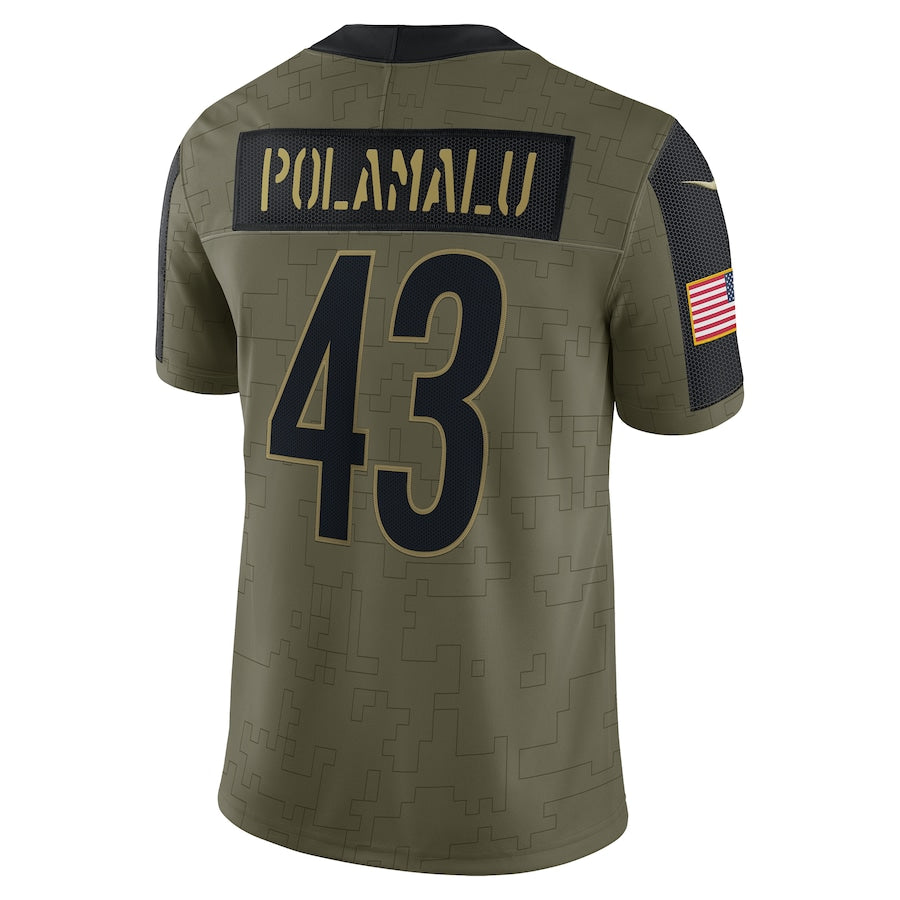 Show your admiration for a Steelers legend with the Troy Polamalu Olive 2021 Salute To Service Retired Player Limited Jersey. Designed to honor the retired player, the jersey features the commemorative Salute To Service patch and a comfortable, stylish fit. Support a good cause while honoring your favorite player.