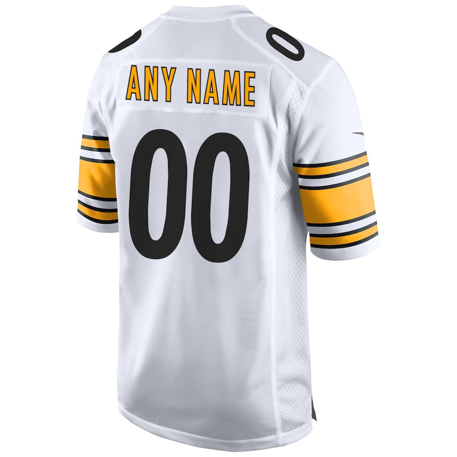 Made with high-quality materials, this White Pittsburgh Steelers Away Custom Game Jersey is perfect for any football fan. Show your support for your favorite team with a personalized jersey, featuring the iconic Steelers logo and customizable name and number. Experience comfort and style while cheering on your team to victory.